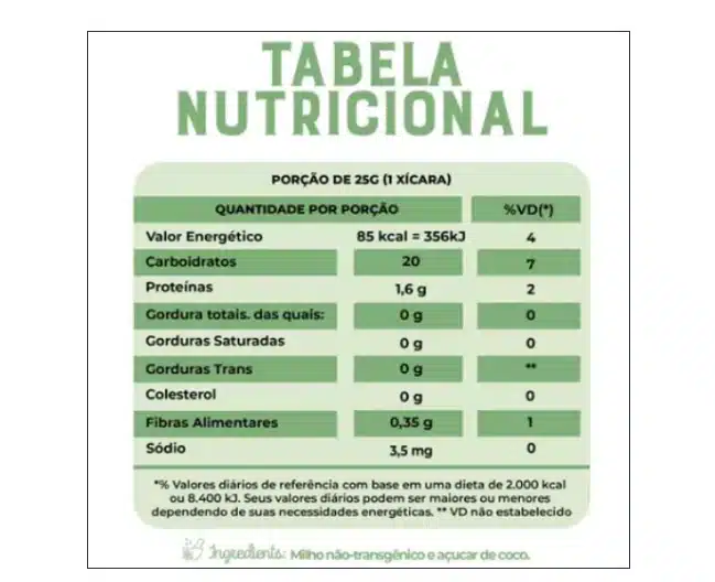 Ingredientes : milho não transgênico, açúcar de coco orgânico.